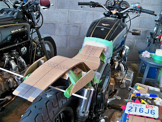 Duct tape has been placed on the frame where the heavy sculpting will happen so it doesn't get hacked and the cardboard is back in place. A new piece of cardboard is in place to widen the butt stop over the sides of the frame horns and another piece is in place for the transition between the the seat and the back of the tank. The hash marks indicate where I will have to cut out the cardboard so the fiberglass can sit on the frame and support the whole thing. The seat will be attached with bolts through the holes in the frame horns originally for the stock fender so I created enough space between the tail sides and horns for T nuts to be fiberglassed in. It is important though to keep this part of the tail in tight to the frame because the frame is already quite wide here